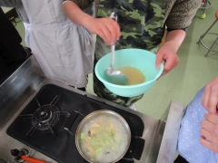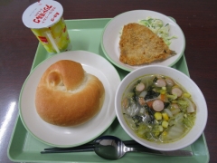 今日の給食は、「米粉パン・はっこう乳・あじフライ・マカロニサラダ・白菜スープ」です。先日の大根と同じで、白菜は冬が旬です。寒くなると甘みが出るそうです。ビタミンやミネラルがバランスよく含まれている白菜を使ったスープ、白菜の甘みを味わいながらいただきました。ごちそうさまでした。