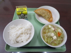 今日の給食は「米飯・牛乳・津ぎょうざ・魚めんのスープ」です。人気メニューのひとつである「津ぎょうざ」。給食室で調理員さんがひとつひとつ手作りしていただいています。美味しくいただきました。ごちそうさまでした。