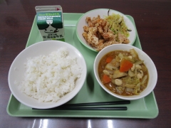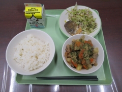 今日の給食は「米飯・牛乳・チキンカレー・海藻サラダ」です。海藻の色は、育った海の深さが浅いと緑や茶色になり、深いと赤色になると教えていただきました。今日も美味しくいただきました。ごちそうさまでした。画像はありません。