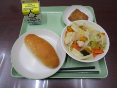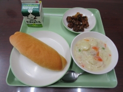 今日の給食は、「コッペパン・牛乳・くじらの竜田揚げ・クリームシチュウ」です。全国学校給食週間で、今日は「昔」の献立です。昭和20年から30年代の給食では、くじらの肉が使われていました。今ではほとんど食することが少なくなったくじら、よくかんで美味しくいただきました。ごちそうさまでした。