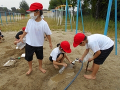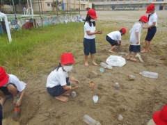 1年生が生活科の時間にどろんこ遊びをしました。朝、登校時に「今日どろんこ遊びするから、着替えやカップ持ってきたよ」と見せてくれました。