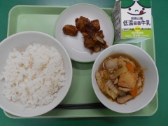 ★今日の給食は鶏すきと里芋のみそがらめでした。新メニューの里芋のみそがらめは、里芋とごぼうを油で揚げた後、甘味噌とごまであえてあり、とても美味しかったです。子どもたちにも好評で、今後の定番メニューになるといいなと思いました。