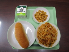 今日の給食は、「小型玄米パン・牛乳・きのこ入りイタリアンスパゲッティ・フライビーンズ」です。10月の献立テーマは「秋いっぱいメニュー」です。秋が旬の食べ物が登場するので、楽しみです。今日もきのこもおいしくいただきました。ごちそうさまでした。