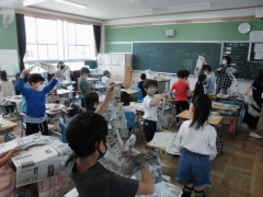 ★2年生の図工では「新聞紙と遊ぼう」キラキラの笑顔で新聞紙を切り裂いていました。