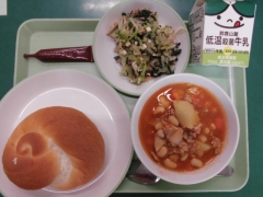 ★今日の給食はポークビーンズと骨こつサラダとミルメークでした。ミルメークは牛乳に入れるとチョコレート牛乳になります。(パンにつけてチョコレートパンの子もいました)牛乳が苦手な子もおいしそうに飲んでいました。骨こつサラダにはひじき・チーズ・ほうれん草などカルシウムが豊富な食材が入っていました。