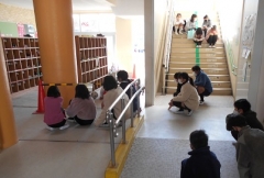 ★廊下にいた子どもたちは壁から離れて頭を守ってしゃがみます。(この写真はその後の写真)