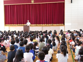 暑い中、校長先生のお話を最後までしっかり聴いていました。