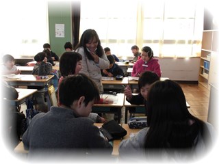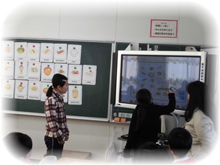バランスの良いメニューや誕生日のメニューをペアで考えた後、、電子黒板を使って会話の練習をしました。