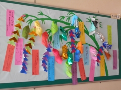 ★昇降口の掲示板には七夕の飾りが登場。たんぽぽ学級の子どもたちがそれぞれの願い事を書いていました。明日は七夕‥みんなの願い事がかないますように・・。