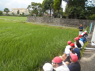 この日,イネの成長の様子を見るため田んぼへ行きました。田んぼの管理をしていだいているJAの職員の方から「今の時期は,イネが倒れるほど大きくなりすぎないように水を抜いて成長を止めている」ということを聞きました。あと10日ほど経てば再び水を入れるそうです。今後の成長が楽しみですね。