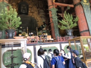 昼食後は班別にチェックポイントを回り、二月堂や鐘楼を見た後、大仏殿前に集合。大仏殿に入るやいなや『うわぁ!こんなに大きいの?』と言う声が。大仏様の大きさを実感した子どもたちでした。