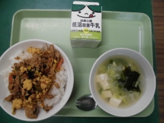 ★今日の給食はビビンバと中華スープでした。今日のビビンバには「大豆もやし」が入っていました。緑豆もやしと比べると、大豆の形が残っていて、根っこの部分は細くて長いのが特徴です。子どもたちは、しっかりかんで食べていました。