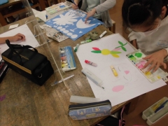 ★1年生が画用紙いっぱいにあじさいの花を描いていました。この後、絵の具で色付けをするそうです。どんな作品になるかな?