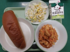 ★今日の給食は鶏肉のバーベキューソース煮とコーンサラダでした。バーベキューソース煮はケチャップが入っていて少し甘めの味付けで美味しかったです。