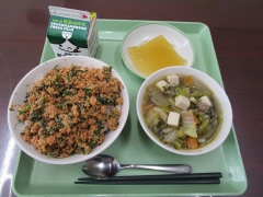 今日の給食は、「さけ丼・牛乳・けんちん汁・手作りりんごゼリー」です。今日のりんごゼリーは、給食室で作っています。つるんとした食管や甘酸っぱいさわやかな風味を味わいながら美味しくいただきました。ごちそうさまでした。