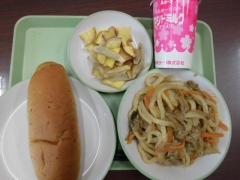 ★今日の給食は焼うどんとベジタブルチップスでした。ベジタブルチップスはカラッと揚がっていて、パリパリで、野菜の苦手な子どもたちもおいしそうに食べていました。