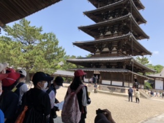 法隆寺に着きました。今回は各クラスに一人ずつボランティアガイドさんをお願いしたので、詳しく説明を聞きました。