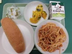 ★今日の給食はツナとトマトのスパゲッティとかぼちゃチーズとお月見団子でした。