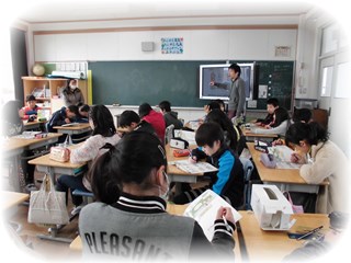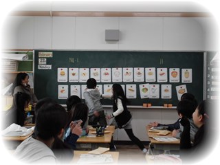 料理の言い方を何度も発音練習したあと、各国の給食について、教科書の挿絵を見ながら、どの国の給食かを予想しました。