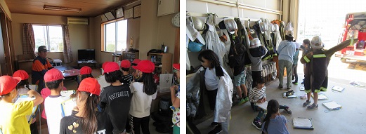 火事や事故が起きた時に消防署だけでなく地域の安全を守る消防団に注目し,三重地区にある三重消防団を見学しに行きました。火事だけでなく,台風の際にもここで待機したり,河川が氾濫していないかを点検したりしていることを学習しました。消火活動の仕方を聞き,防火服やホースのつなぎ方などをみせていただきました。