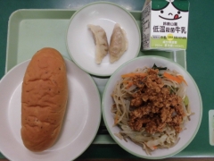 ★今日の給食はジャージャー麺と揚げ餃子でした。ジャージャー麺は汁がなく、中華麺の上にのっている肉みそを混ぜて食べます。「焼きそばより好き」「焼きそばのほうが好きかな?」意見が分かれるようです。