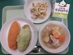 ★今日の給食は緑茶あげパン、鶏肉と新じゃがのスープ煮、コーンサラダでした。あげパンは、シナモン味やきなこ味などもありますが、今日は緑茶味でした。「緑茶は4月から10月ごろにかけて約4回収穫されます。特に、5月ごろに収穫されるお茶の葉は、新茶と呼ばれ、葉が柔らかく、ビタミンなどの栄養が多いのが特徴です。今日は、四日市でとれた緑茶を使っています。」とお昼の放送で説明してくれました。子どもたちに大人気のあげパンですが、最近は「ちょっと苦手・・」という子もいます。食生活の変化を感じます。