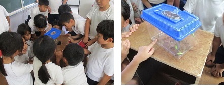 少し涼しくなってきました。理科では,昆虫の学習をしています。まず,学校の中庭や運動場にいる昆虫を探しました。次に教室に戻り見つけた昆虫を,それぞれどこで何にをしていたのか発表しあいました。また,見つけた昆虫をよく観察し,大きさや色,昆虫が暮らしている場所や食べ物について考えました。子どもたちからは,「大きさが全然違うね。」「草を食べるから緑色なのかな。」「緑色だと隠れやすいのかな。」と様々な考えが出ました。