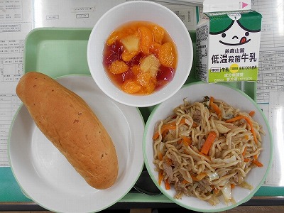今日の給食は、小型玄米パン、焼きそば、フルーツポンチでした。焼きそばには、にんじん・たまねぎ・もやし・キャベツ・チンゲン菜とたくさんの野菜が入っていました。