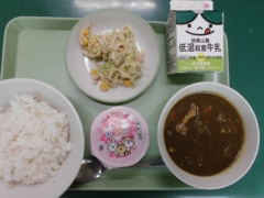★今日の給食はカレーとツナサラダとお祝いゼリーでした。今年の1年生はたくさん食べる子が多く、初日から食缶が空っぽになっていました。