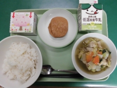 ★今日の給食はがんもどきの煮つけと海鮮ちゃんこ鍋とお祝いケーキでした。