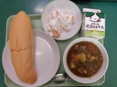 ★今日の給食はカレーシチュウ(昔の言い方です)とフルーツクリームでした。大きなパンの真ん中に切れ目があるので、そこにクリームを入れてフルーツサンドにして頬張っていました。どの子も大喜び。普段完食できない子たちも、きれいに食べきることができていました。