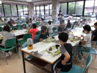 夕食時も席の間隔をあけ、黙食しました。野菜のドレッシングはコーン味が人気でした。