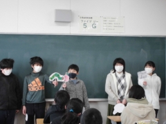 ★ペープサートを作成したり、桃太郎では剣や盾を作ったり・・英語の発音もなかなかのもので、練習をした成果が表れています。卒業を前に思い出が一つ増えました。