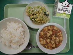 ★今日の給食はマーボー豆腐とナムルでした。マーボー豆腐は辛さもちょうどよく、ご飯にかけて美味しそうに食べていました。