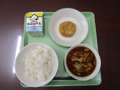 今日の給食は、「米飯・牛乳・手作りれんこんミンチカツ・みそ汁」です。「手作りれんこんメンチカツ」は、栄養教諭と調理員さんが一緒に考えて、工夫してできた献立のひとつです。美味しくいただきました。ごちそうさまでした。