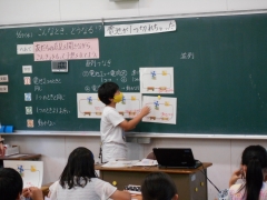 ★「(直列つなぎと並列つなぎ)2本のうち1本の乾電池が切れたら、プロペラはどうなるか?」という課題に対し、根拠をもって予想し、実際に実験をして確かめるという授業でした。子どもたちが意見を交わす中で、