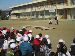 長なわ大会の前に、なわとびクラブの技の披露がありました。四日市中央工業木工部の生徒さんたちが制作し、PTAからいただいた「おたぴょん」も活用しています。