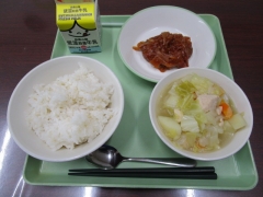 今日の給食は、「米飯・牛乳・ハンバーグのトマトソース煮・ポトフ」です。今日のポトフは、鶏肉、にんじん、だいこん、たまねぎ、じゃがいも、キャベツと、具沢山で野菜のうまみを味わいながら美味しくいただきました。ごちそうさまでした。