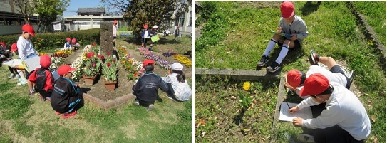 3年生になり,初めて理科の学習をしました。この日は,学校に咲いている植物の観察を行いました。観察の仕方を事前に話し合い,葉や花の形や模様,大きさなどに気をつけて描きました。少ない時間の中どの子もていねいに観察しようとしていました。