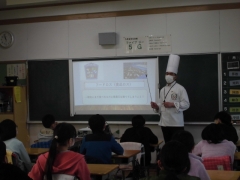 ★食育アドバイザーの近藤さんは、ホテルのコックさん。全国で年間42兆円もの食品(25mプール2万個分)が廃棄されていることやバイキング会場では食べられる分だけを皿にとって食べてほしいことなど、具体的な話を聞かせていただき、子どもたちは自分たちの食生活について見直すことができました。最後に「作る責任もあるけど、使う(食べる)責任もある。食べ物に対する意識を変えていくことが大切」という話が心に残りました。