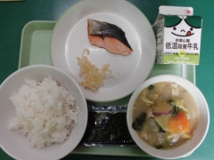 ★今日の給食は焼きのり・たくあん・鮭の塩焼き・味噌汁でした。