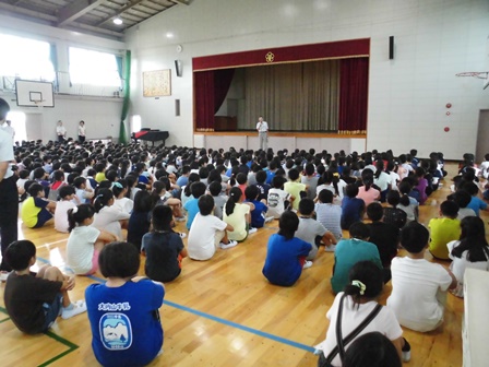 今日から2学期が始まります。両手には,夏休みの宿題などの荷物をいっぱい持っての登校です。教室であいさつをした後,体育館で始業式。残暑のため蒸し暑い体育館かと思いきや,接近してきている台風の影響で風が吹き込み,過ごしやすい始業式となりました。