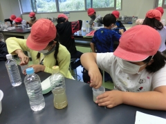 ★水質チェックでは、家庭から持ってきた水を容器に入れて水の汚れ具合を調べました。