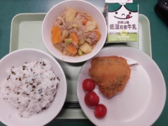 ★今日の給食はわかめご飯とアジフライとミニトマトと肉じゃがでした。今日のアジフライはサクサクでとても美味しかったです。