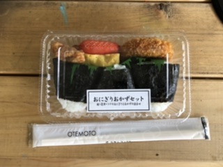 おにぎりおかずセット。唐揚げ、ウインナー、卵焼き、コロッケ。おにぎりの具はシャケ、ツナ、こんぶでした。