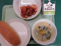 ★今日の給食はほきのケチャップがらめとチーズ入り豆乳チャウダーでした。ケチャップがらめは子どもたちの大好きな味付けで、魚の苦手な子どもたちもおいしそうに食べていました。