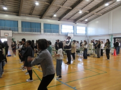 ★田中さんのお話の前に、6年担任団が舞台に上がり、さらに6年生と保護者の方は起立をし、軽い運動ということでストレッチをしました。その名も納豆体操‼「ね~ばねば♪」