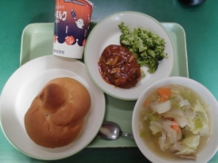 ★今日の給食はハンバーグきのこトマトソースとゆでブロッコリーとポトフでした。ハンバーグはふっくらしていてとても美味しく、パンにはさんで「ハンバーガー!」と喜んで食べている子もいました。