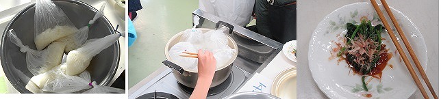 家庭科の学習で,米飯,ホウレンソウのおひたしを調理しました。今年はコロナウイルス感染対策のため,鍋で一緒に作ることができません。防災パッククッキングとして一人分をビニール袋に入れて調理しました。子どもたちは,家庭で食べるご飯の味が再現でき喜んで食べていました
