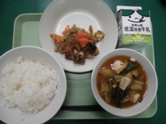 ★今日の給食はしいらとごぼうの南部揚げと地物たっぷり味噌汁でした。今日は、月に2回ある「みえ地物一番給食の日」でした。今日の三重県産の食べものは、米、牛乳、しいら、米粉、油あげ、生しいたけ、豆腐、小松菜、水耕ねぎです。地元で作られた食材は、新鮮でおいしいだけでなく、運ぶ距離が短くなるので環境にもやさしいですね。地元の食べ物をもりもり食べて、元気いっぱいの三重っ子になろう!